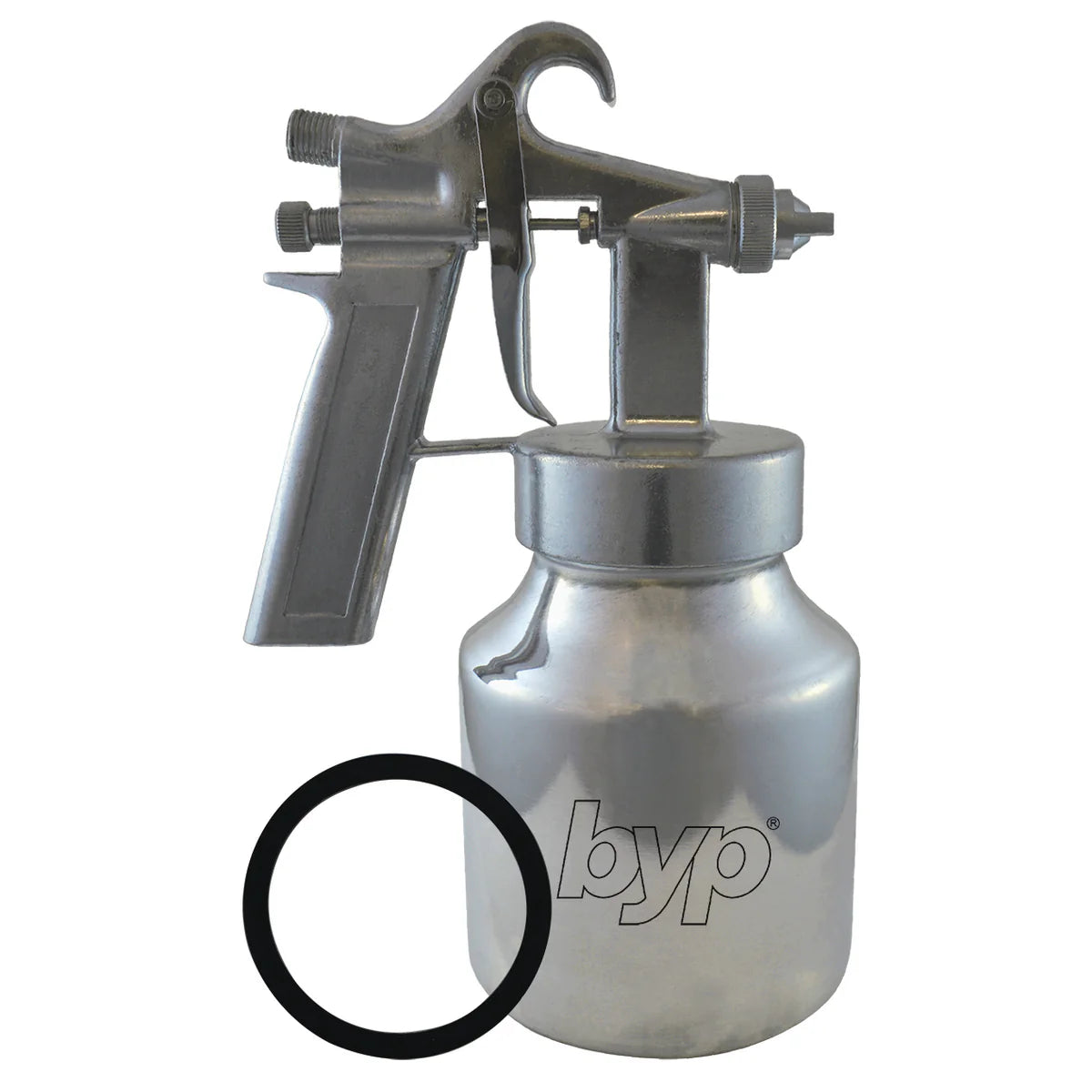 Pistola de succión que mezcla la pintura con el aire de manera externa, trabaja con baja presión e incluye vaso de metal.